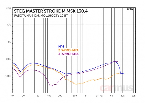 Теперь о том, каковы искажения на разных частотах. На СЧ, как водится, уровень КГИ ниже, но по всему диапазону в любом случае не вылетает за пределы сотых долей процента.