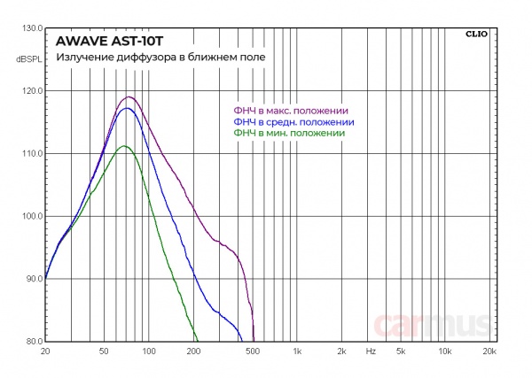 Для проверки располагаю микрофон в ближнем поле – буквально в паре сантиметров от диффузора и снимаю характеристику излучения при разных положениях регуляторов.