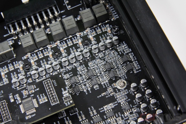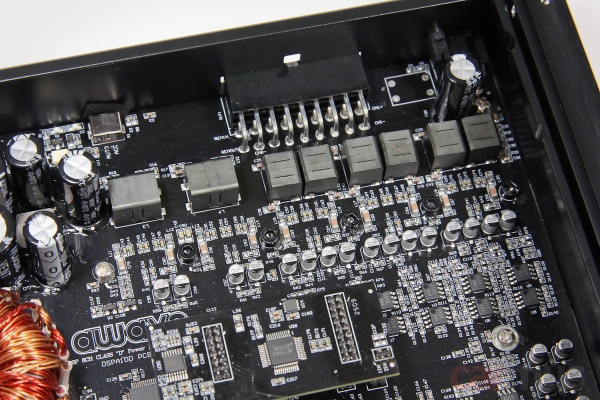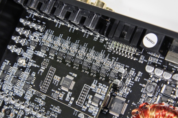 Всё, кроме процессорной части, собрано на общей плате. Каналы усилительной части неравноценны: в 7 и 8 используются чуть более крупные дроссели выходных фильтров. Это, по задумке, и должно обеспечить больший токовый запас относительно каналов 1-6. Процессорная часть вынесена на субплату – здесь используется хорошо известный и вполне приличный чип АК7735.