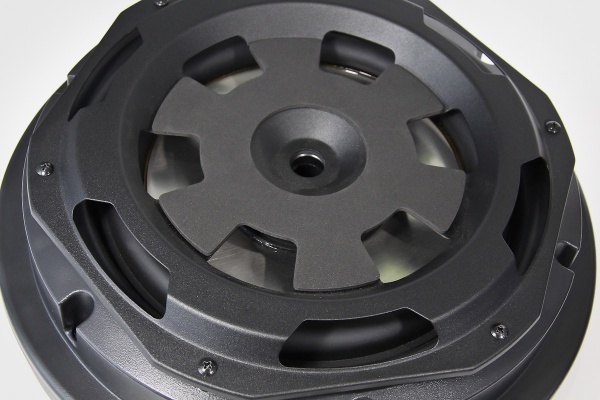 Сам излучающий диффузор – плоская алюминиевая «шайба», которая держится на традиционном подвесе по периметру и дополнительно – на центральном подвесе. Оба – резиновые. Номинальный диаметр динамика – 10 дюймов.