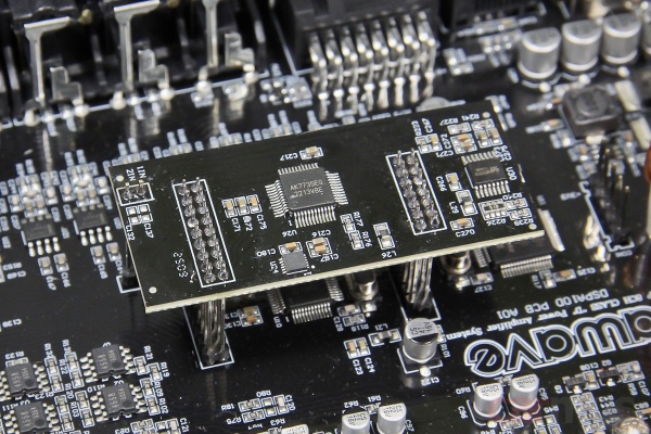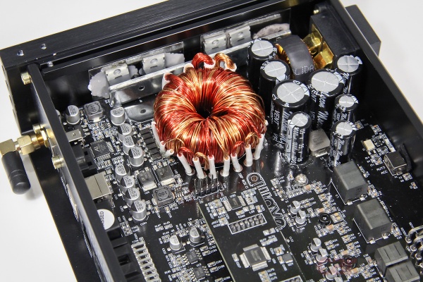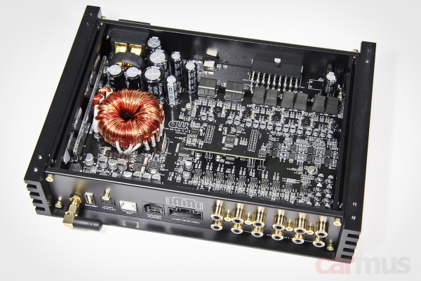 Всё, кроме процессорной части, собрано на общей плате. Каналы усилительной части неравноценны: в 7 и 8 используются чуть более крупные дроссели выходных фильтров. Это, по задумке, и должно обеспечить больший токовый запас относительно каналов 1-6. Процессорная часть вынесена на субплату – здесь используется хорошо известный и вполне приличный чип АК7735.