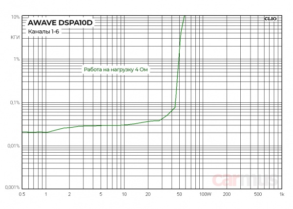 Поскольку для каналов 1-6 заявлена работа только на 4 Ом, не стал искушать и снял зависимость КГИ от выходной мощности только на такую нагрузку. Ограничение, как и обещано, наступает при достижении отметки примерно в 50 Вт – тут всё честно.